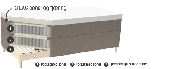 Soneinndelt pocket i begge madrassene, kombinert med soneinndelte og fjærende trespiler i bunnrammen, gir ekstra god avlastning for skuldrene og ideell støtte til hoftene.